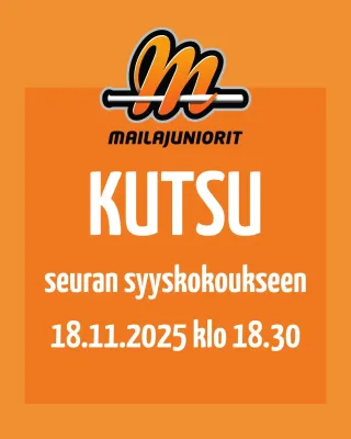 Mailajuniorit ry:n sääntömääräinen syyskokous pidetään tiistaina 18.11.2025 klo 18.30. Paikkana seuran toimistotilat osoitteessa Torikatu 4, Kank…